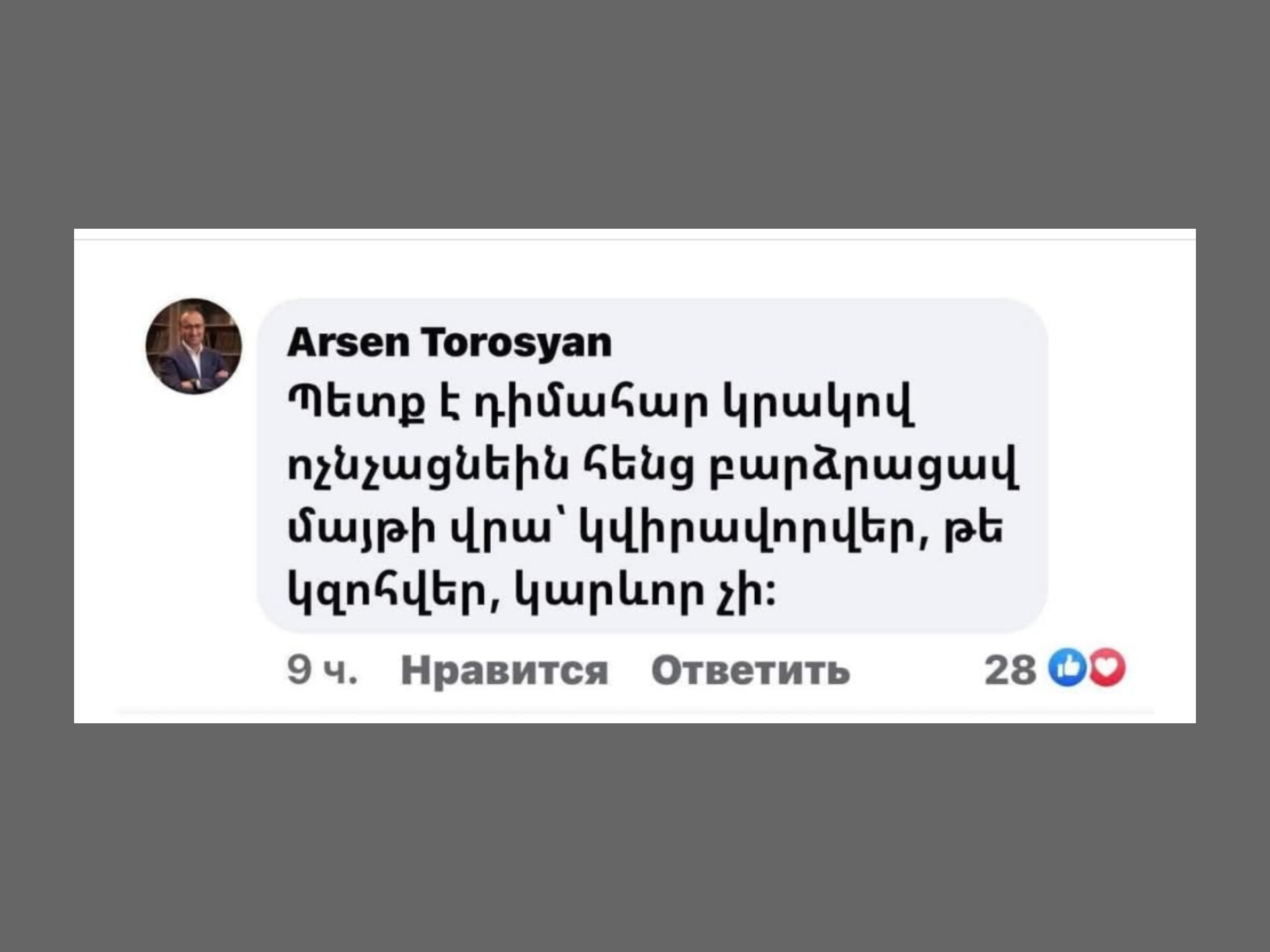 Սա ժողովրդավար Արսեն Թորոսյանի 2-3 տարի առաջվա գրառում է՝ Հանրապետության հրապարակում մայթ բարձրացած մեքենայի վարորդի մասին։