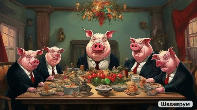 Հ․Գ․ «Անասնաֆերմայի» եզրափակիչ հատվածում նկարագրված է, թե ինչպես են ճոխության, ալկոհոլիկության, թալանի դեմ հեղափոխություն արած խոզերը խրախճանք կազմակերպում։ Օրուելի ստեղծագործությունը բոլոր ժամանակների համար է գրված։