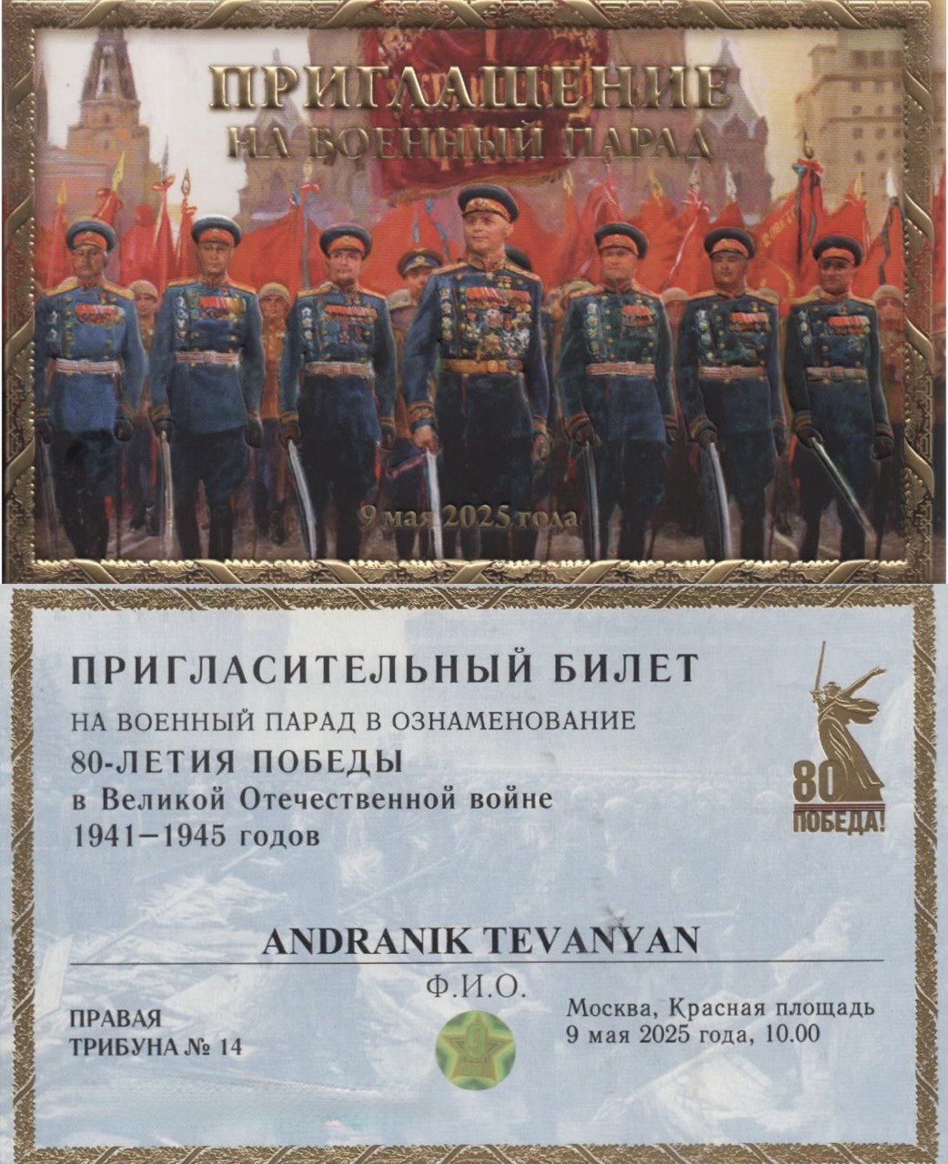 Որպես «Մայր Հայաստան» շարժման ղեկավար պաշտոնապես հրավիրվել եմ և ներկա եմ գտնվելու Ֆաշիմի դեմ տարած հաղթանակի 80–ամյակին նվիրված Մոսկվայի Կարմիր հրապարակում տեղի ունենալիք Հաղթական շքերթին։