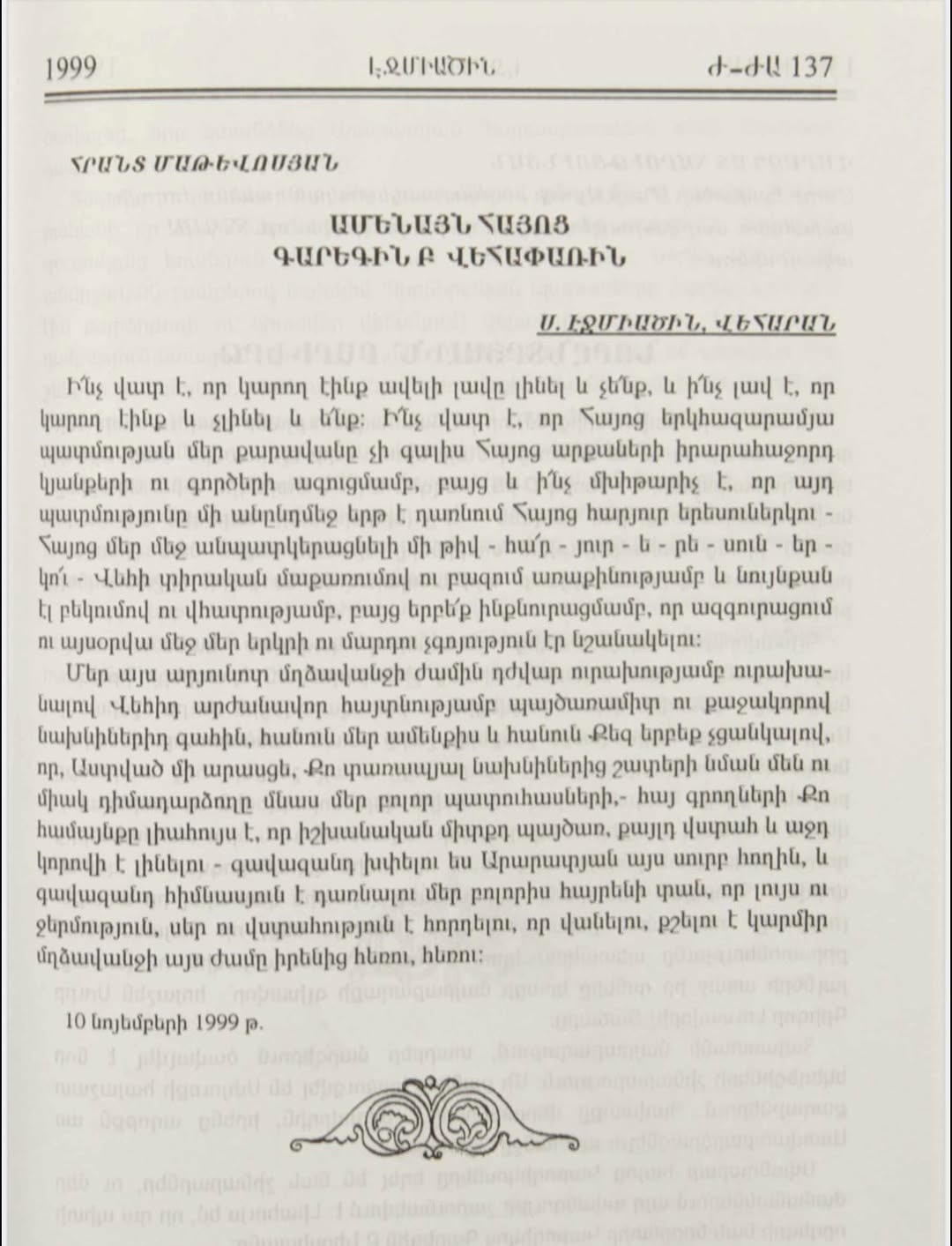 Փա՜ռք Աստծո, Վեհափառ Հայրապետը վեմի պես անսասան է և լիովին հավատարիմ է իր ծանր խաչը մինչև վերջ պատվով կրելու ուխտին։