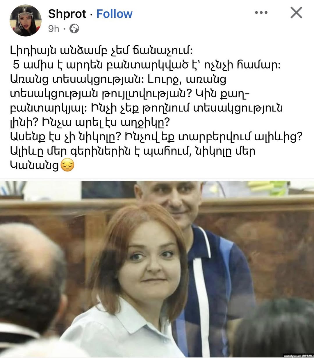 Հանրային անուն ու լսարան ունեցող, բայց «քաղաքականությամբ չզբաղվող» հարգելի՛ կանայք։ Լիդիայի նկատմամբ ծայրահեղ անարդար, անմարդկային վերաբերմունքի մասին լռելը պարզապես ամոթ է։ Ձե՛ր ամոթն է։ Առհասարակ՝ ամոթ է, որ կա նման հարց։ Ամոթների ամոթն է։