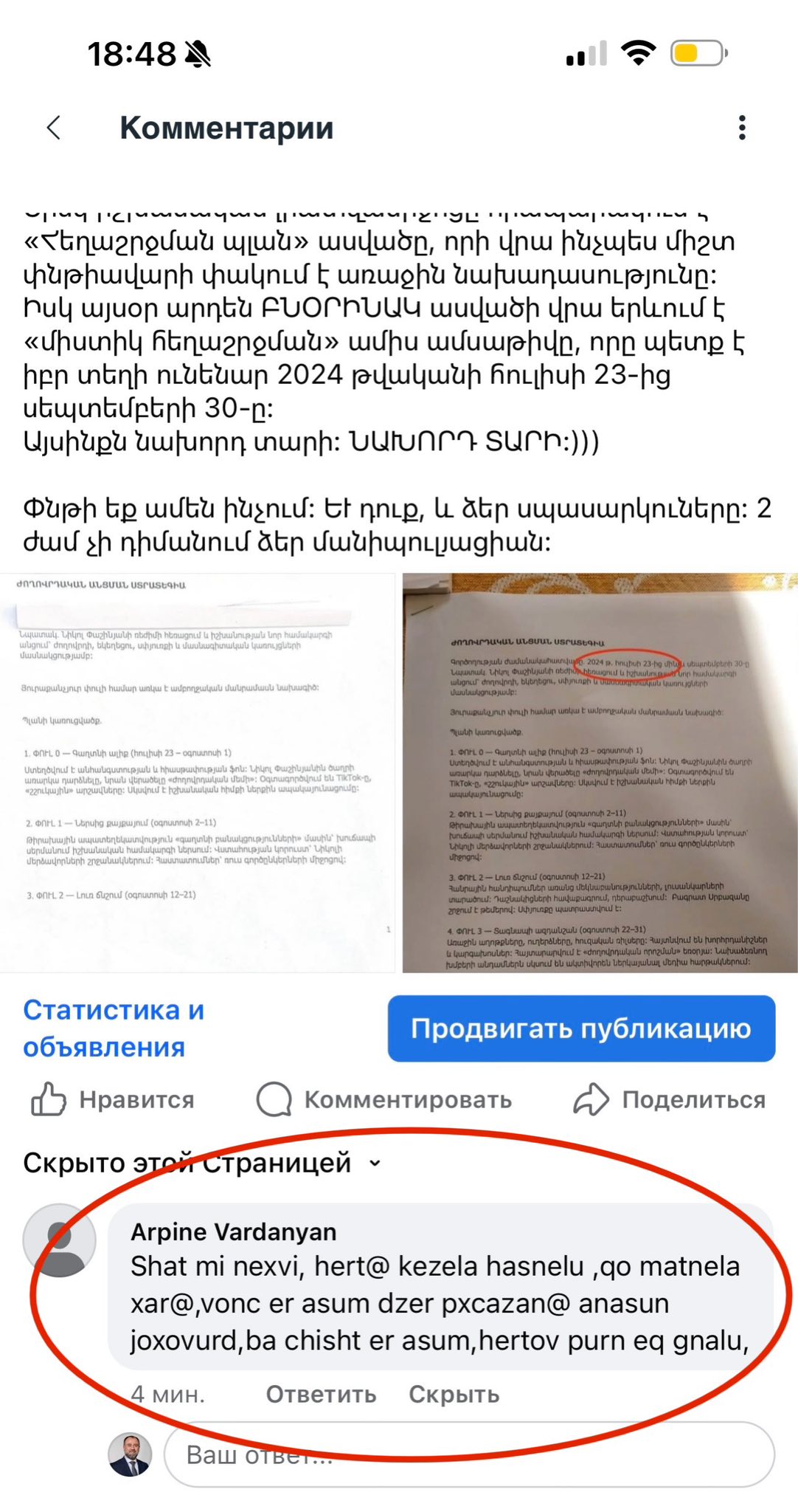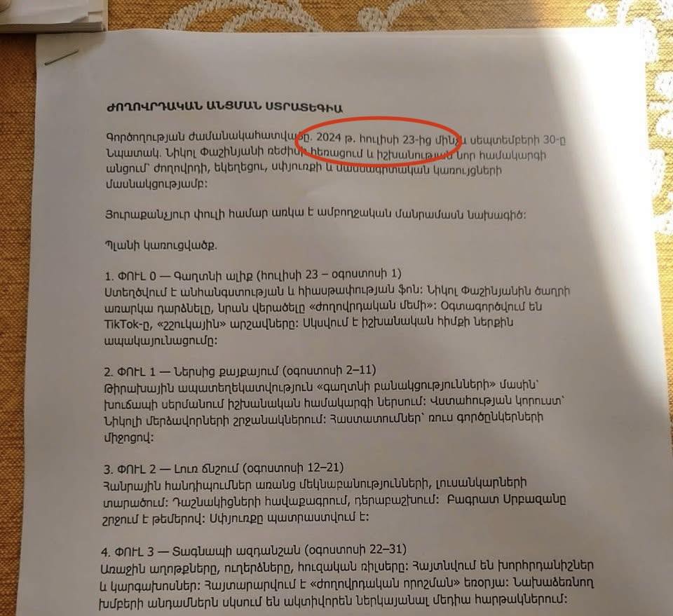 Երեկ իշխանական լրատվամիջոցը հրապարակում է «Հեղաշրջման պլան» ասվածը, որի վրա ինչպես միշտ փնթիավարի փակում է առաջին նախադասությունը: Իսկ այսօր արդեն ԲՆՕՐԻՆԱԿ ասվածի վրա երևում է «միստիկ հեղաշրջման» ամիս ամսաթիվը, որը պետք է իբր տեղի ունենար 2024 թվականի հուլիսի 23-ից սեպտեմբերի 30-ը: