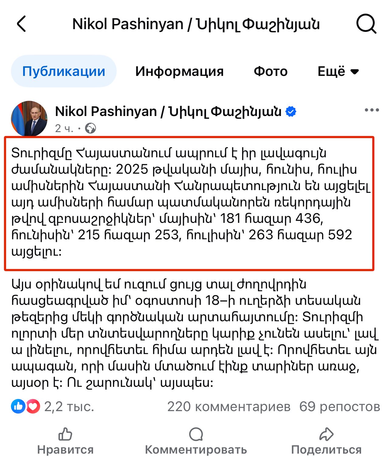 Այսօր Նիկոլը գրում է, որ մայիս-հունիս-հուլիս ամիսներին Հայաստան նախորդ տարվա նույն ժամանակահատվածի համեմատ այցելել է «ռեկորդային» թվով զբոսաշրջիկ (տես նկար 1): Ենթադրենք, որ դա այդպես է, բայց հարց է առաջանում.