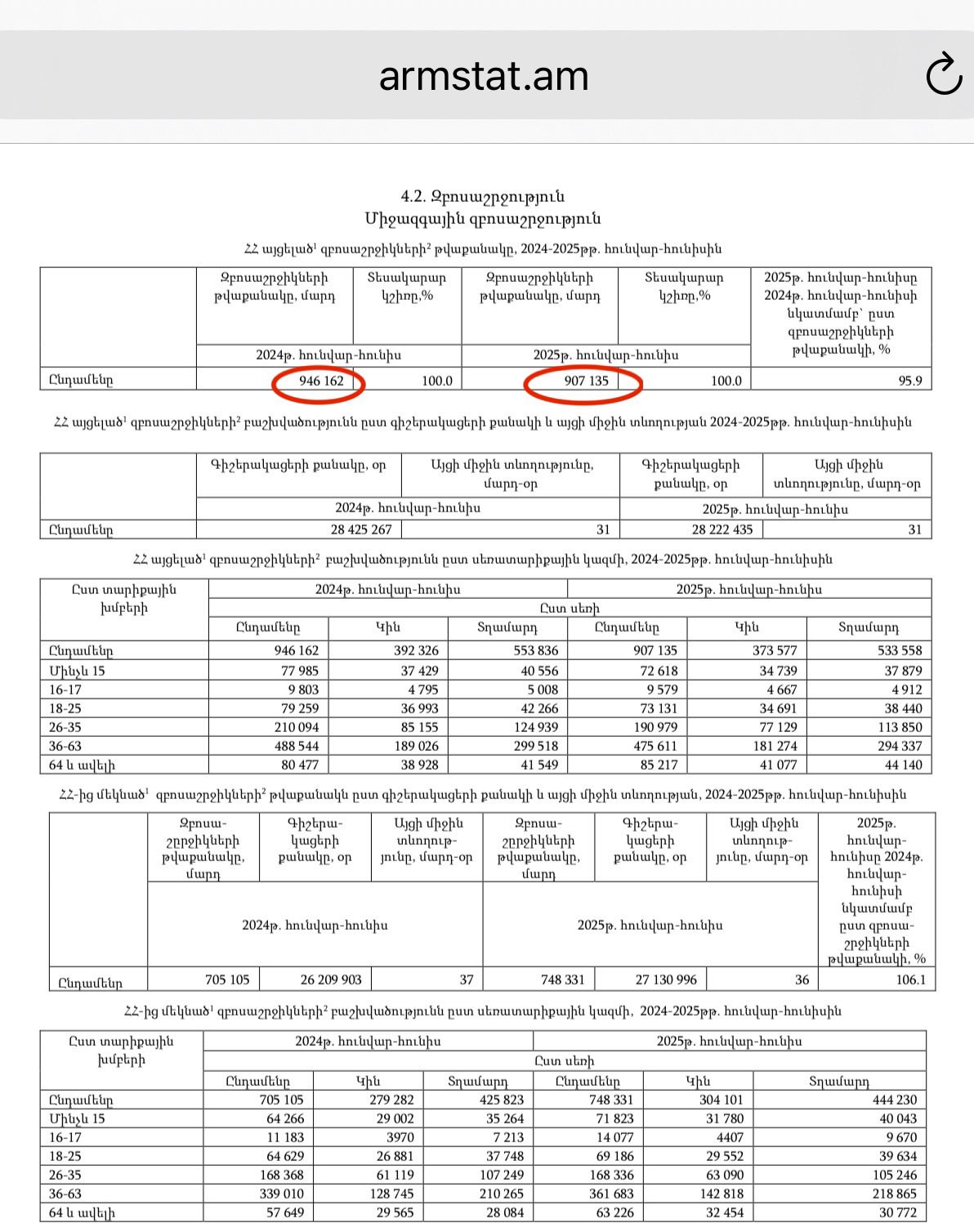 Եթե նույնիսկ սրան գումարենք հուլիսի թվերը նույնպես (2024 թ. 237 603 !!!! 2025 թ. 263 592), ապա դարձյալ 2025 թվականին հունվար հուլիս ամիսներին ՀՀ այցելած զբոսաշրջիկների թիվը նախորդ տարվա նույն ժամանակահատվածի համեմատ պակաս կլինի 13 038-ով: